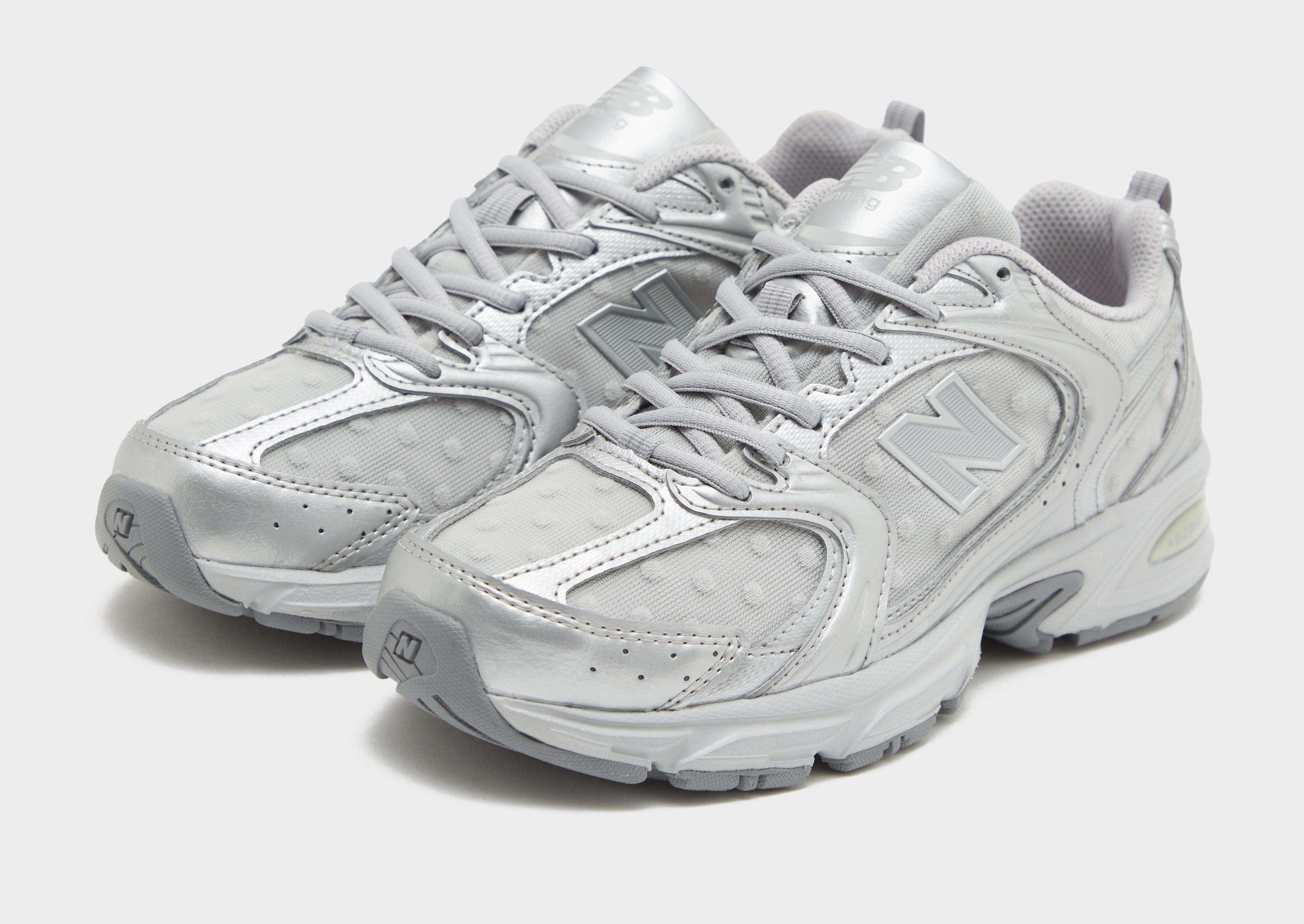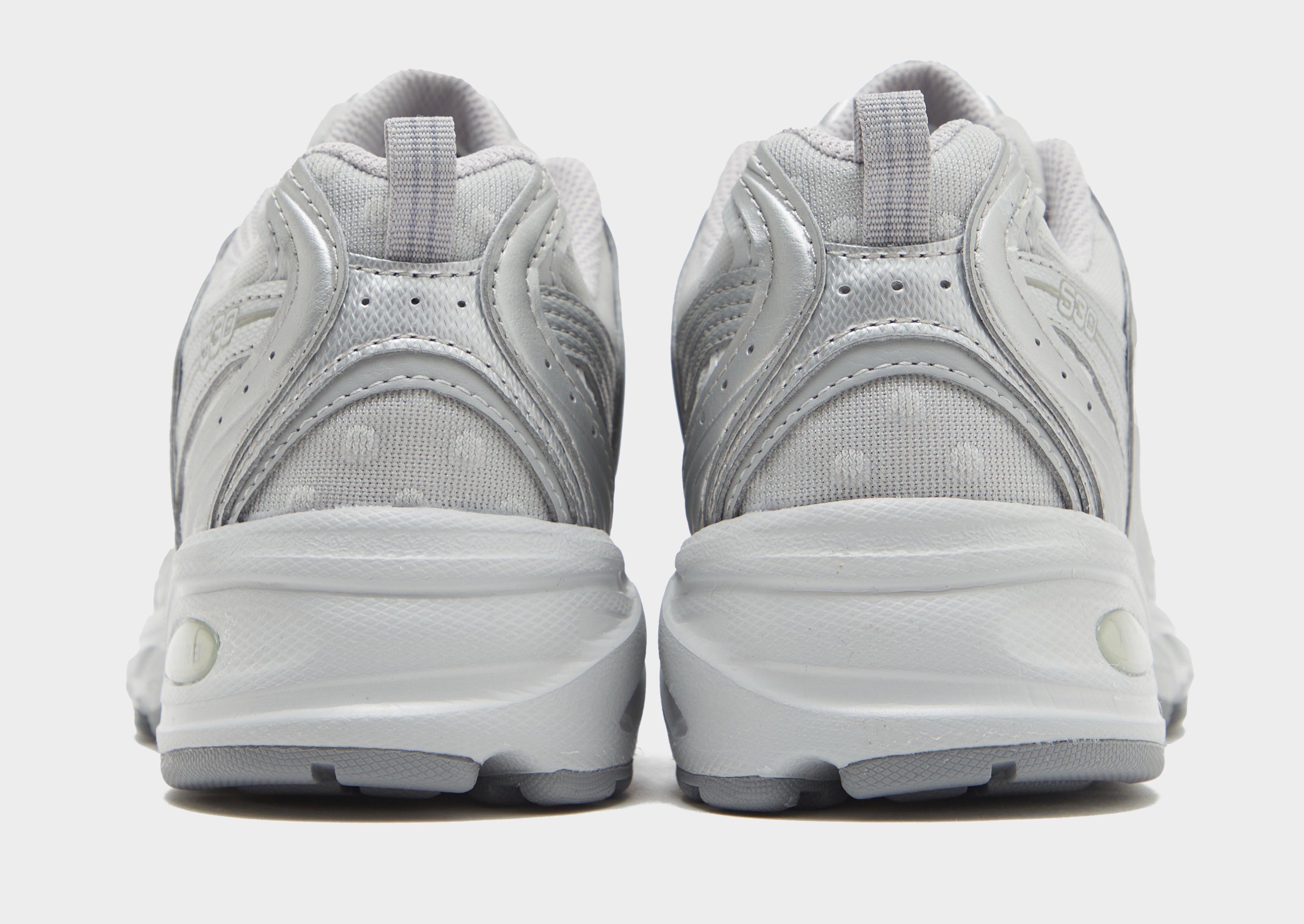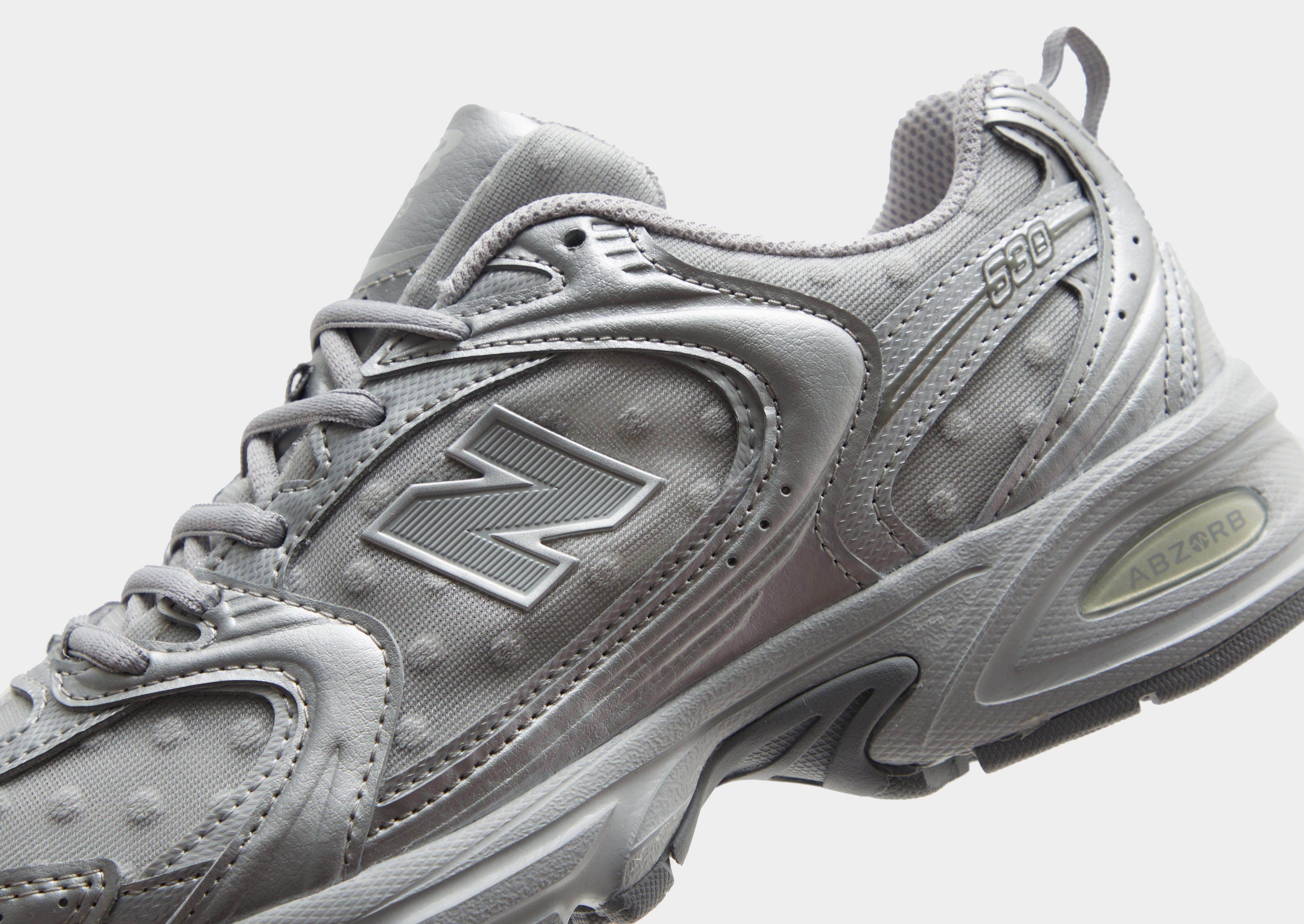 Rafraîchissez votre look avec ces baskets 530 pour femmes de New Balance. Coloris gris et argent Tige en mesh léger et respirant avec des empiècements synthétiques Fermeture à lacets Col de cheville rembourré Languette au talon pour un enfilage et un retrait faciles Semelle intermédiaire coussinée avec semelle intérieure ABZORB Semelle extérieure en caoutchouc adhérente Signature New Balance sur la languette Logo « N » sur les flancs